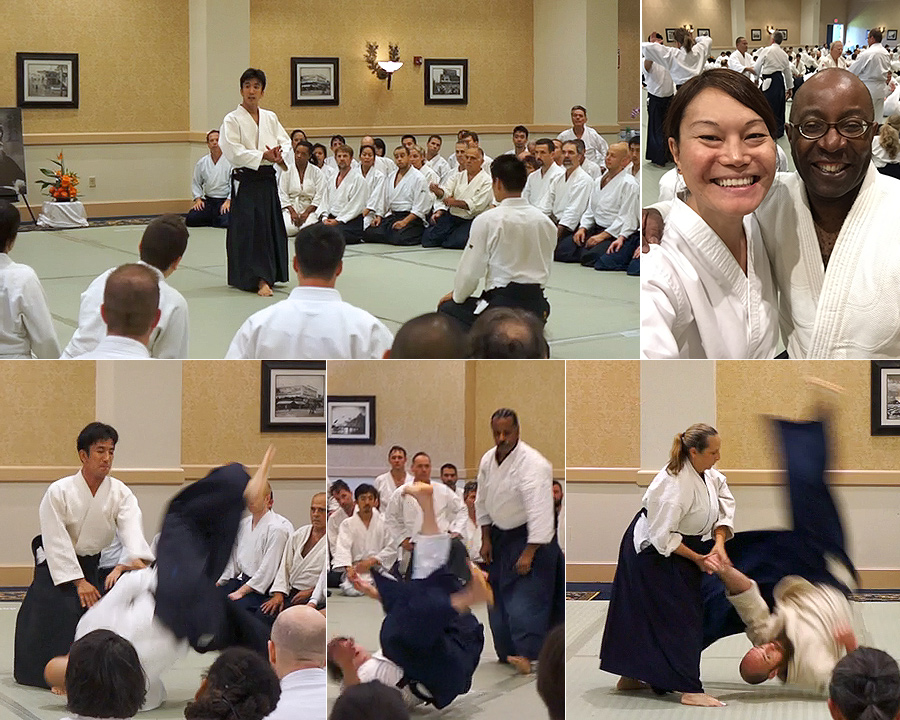 August 6, 2016 - USAF Summer Camp 2016 - My aikido colleague, Ken1, and I trekked from downtown Philly to Absecon to do a day's worth of seminar events at this year's USAF Summer Camp held at the Stockton Seaview Hotel and Golf Club. We attended five classes in all starting with the 6:30am class and ending our day with the 2:00pm class. I practiced a number of rolls prior to the 9:00am class, but I'm not 100% yet. I'm still taking it easy after my recent surgery, so I sat out on most of the techniques while Ken1 was actively participating. Each class was about 45 to 50 minutes of intense, fast-paced instruction. Some techniques were basic. Others, such as those taught by Waka Sensei, combined several techniques into one. Waka Sensei is the real deal. He is fluid, graceful, and powerful without relying on brute strength. He walked around the room demonstrating each technique to small groups of practitoners and allowing them to attack him as uke. Osawa Sensei exhibited raw power in his movements, as heard and felt from the thunderous poundings on the mat from his ukes. He liked that I was practicing my wrist stretching exercises during lunch. Julia Freedgood Sensei, whom I was unfamiliar with until today, deserves special mention. She is small and stocky yet exhibits the kind of flexibility that would put a yoga teacher to shame. Her techniques were minimal in movement yet powerful in outcome. There were many more white belts at this event than at the Christmas Seminar, so I felt more at home. Our dojo was well represented with Dr. John, John, Brendan, Ken1, Ramla, Shanti, and me. A super bonus is I got to meet Jonathan Weiner Sensei whose videos have helped me prepare for my 5th kyu test. All in all, Summer Camp is a fantastic experience for any aspiring aikidoka.