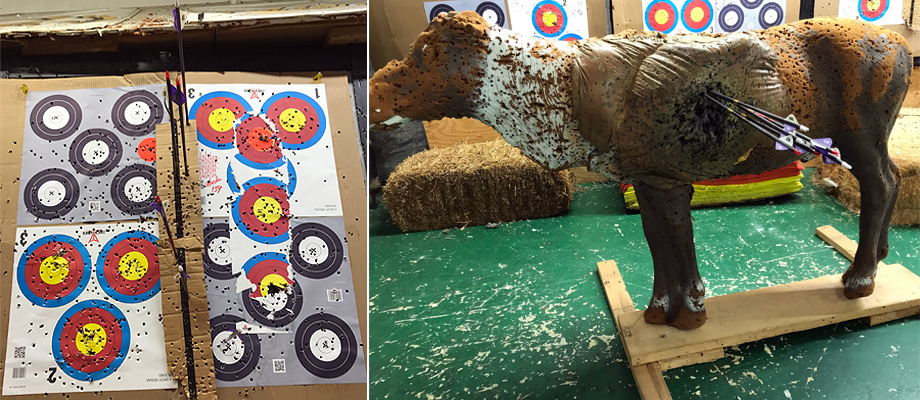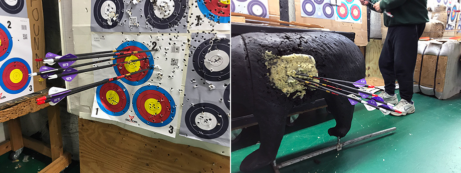 February 5, 2019 - Day 11. I walked into a full house with eight other archers. Tuesdays are typically the barebow archers day. Today was much improved over yesterday. My shots were in line with where I wanted them, but were high, so I aimed lower to compensate. I seem to have a better knack at grouping my arrows on an animal target. I spoke to an archer named Lou who let me try his Mathews Triax hunting bow. It had a 45 pound draw weight, a little heavier than I'm used to. I also tried the PSE Supra that I held yesterday and tried pulling the string, but could not. The draw weight was way too heavy for me. The shop tried to adjust it to its lowest setting, but concluded it would still be too heavy for me. Lou taught me how to keep the tips of my arrows in place with wax.