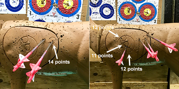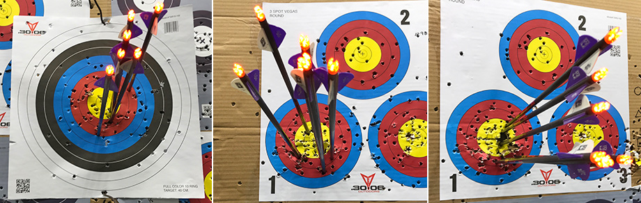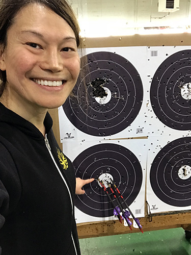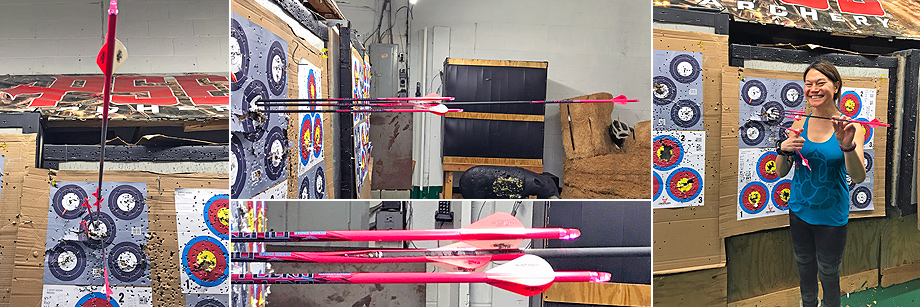 March 4, 2019 - Day 18. I took a step back today. I just wasn't aiming right. It may have had to do with my giving blood for labwork needed for my upcoming surgery. It may also have to do with me not being patient with my shots and breathing correctly. There is always a lot on my mind. I started settling down in the second hour. Bill fletched my new Outlaw Pink arrows and my first set, shown below, looked pretty good. The followup sets looked pretty good, too. As seen below left, I scored 30 out of 30 with six arrows. Bill said that each arrow is built to better tolerances than the Gold Tip Hunter arrows I've been using. He also installed field tips rather than bullet points on them to make them easier to remove. I'm not sure these arrows are actually "better," but they sure are gorgeous. One thing I've noticed at the range is it's pretty much a boy's club. Guys will ask other guys for advice, even if those "expert" guys are not shooting too well. When a new girl enters the range, Bill usually tells her to watch me, which is pretty cool. I must be doing something right.