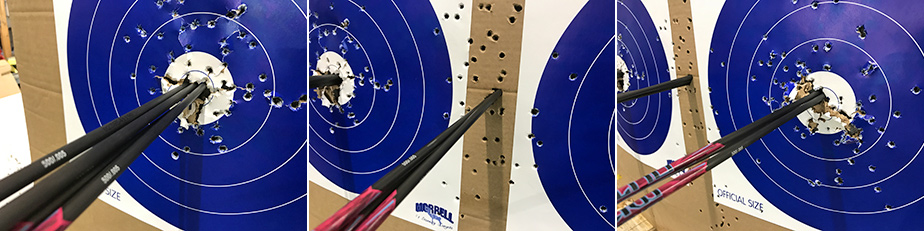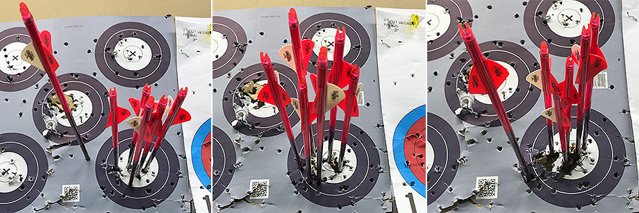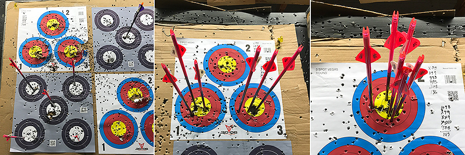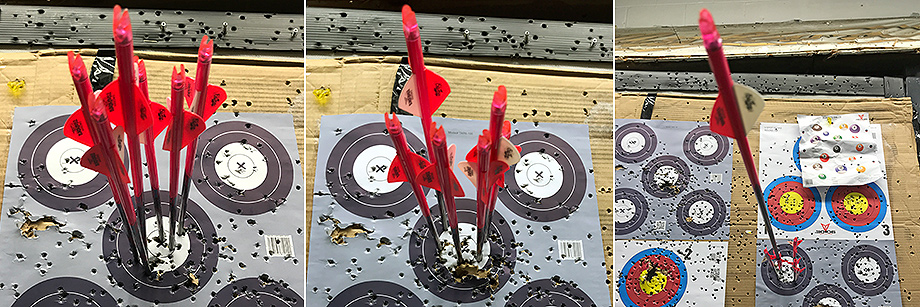 March 9, 2019 - Day 20. Two "Robin Hoods" in two days! This was on the fifth arrow of my first set. Everyone at the range heard the ripping sound and congratulated me when they saw the split arrow. Bill told everyone who entered the range about my new trophy. A little later I shattered a nock and split a third Outlaw Pink shaft, but only an inch, so it should be fixable. Unfortunately, Bill concluded that the the Gold Tip arrow I split back on February 23 wasn't salvageable because the shaft was split too far down. It's funny that the specs on the Outlaw Pinks are only marginally better than the Gold Tips, yet I was never able to split my Gold Tips like this. "The people who write those specs are not shooters," Bill commented. "You have to shoot these arrows to see what they're all about." My youngest son accompanied me today and got to shoot his new Diamond Atomic some more. We both tried Bill's Easton X10 stabilizer. My son actually did very well with it. After a couple of firing mishaps, I adjusted his sight and he was aiming and scoring better. He's very hard on himself, expecting to hit bullseyes quickly, but I assured him that the bullseyes will come with patience and practice. Bill told everyone about how I was putting my time into my practice.