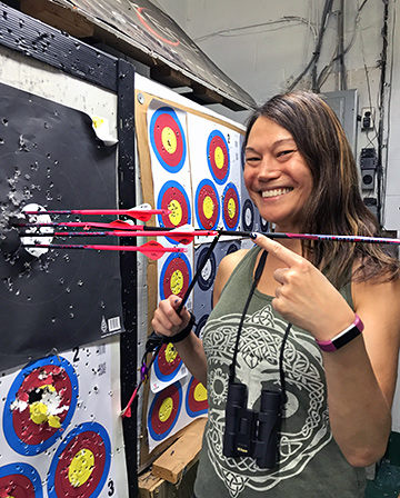 May 16, 2019 - Day 31 - Using Saeko, I scored 277/300 and hit 15 X rings. I shot this without any warmups. For fun afterwards, with the next five arrows, I skewered an orange ball hung off of a nail, three deadly shots on three animal targets, and a bullseye right in the middle of a five spot. I should've stopped right there with my good fortune, but I wanted to continue practicing. I practiced another NFAA 300 round and scored 259/300 and 12 X rings. My bow felt heavier that time. My arms were shaking and I ended up missing three out of sixty targets in that round. I was quite tired after the second 300 round. To improve my form, Bill and Herb recommended I squeeze my trigger (as in squeeeeeze my index release slowly) rather than press it quickly as I've been doing.