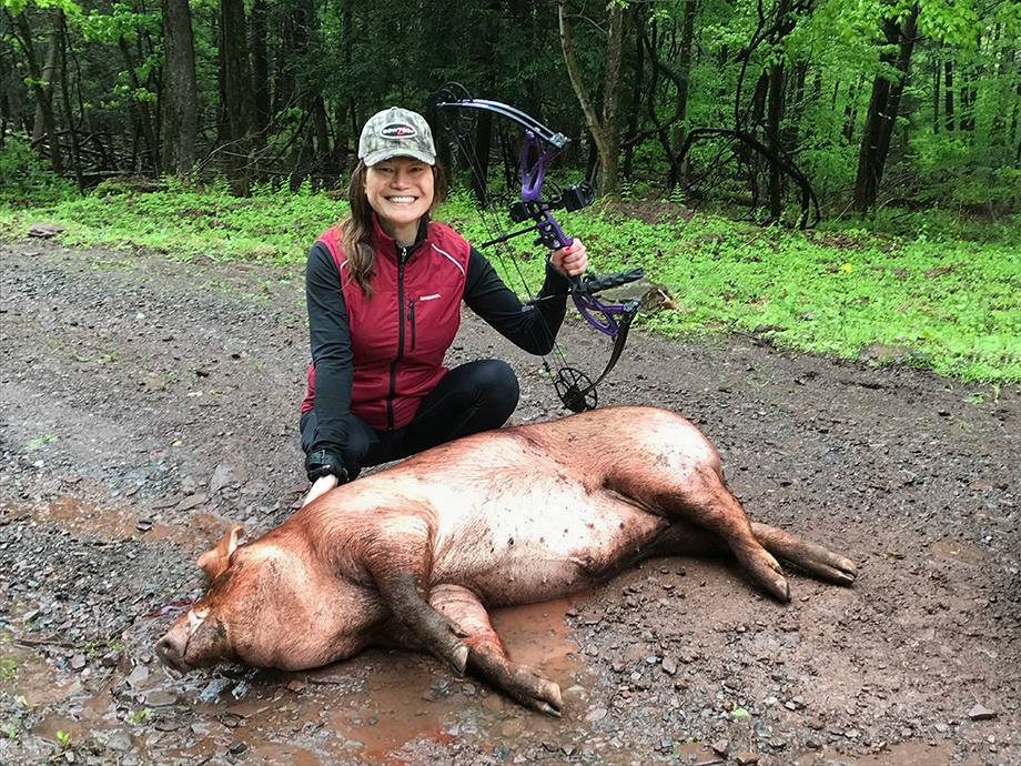 May 12, 2019 - Day 30. Mother's Day Hog Hunt. Bill, my kids, and I drove up to a 400-acre private hunting ground in Lycoming County, Pennsylvania where I signed up to do my first hunt. Amid the onslaught of wind and rain during our three-hour drive and the other three members of our group cancelling on us last minute, it seemed as if someone high up above was testing us. We started our day with a 4:00am wakeup and arrived at the hunting ground at 8:00am. We met Rocky, the owner of the hunting ground, and his two assistants. Donuts and coffee were provided as Rocky gave me the details of what I should expect during my hunt. Because of the rain, I could not experience the hunt by foot, which is how it's usually done. We took a Land Rover truck around the hilly path searching for one of the two red hogs on the grounds. We saw a myriad of wildlife, including turkeys, rams, deer, Watusi buffalo, and a special "Black Death" Cape buffalo. Two Watusi buffalos spotted us and started chasing our vehicle, but we drove too fast for them to catch up. Our guide said that he spotted one hog deep in the forest and the other on top of the hill earlier in the day. We tried to find the hog in the forest, but couldn't see him. We went up the hill, turned a corner, and spotted the other hog continuing along the path we were on. Our guide stopped the truck and I climbed out of it, taking a moment to look at the monstrosity. The hog looked at us, huffed and snarled, and started walking towards us. Our guide feinted a step and a kick and the hog backtracked. I'm not sure we were in any real danger since the hog didn't have visible tusks, but I'm not a hunting expert. "Take your time," Bill said. I situated myself, took aim, and shot. I aimed at the spot Bill and Herb instructed me to, but my arrow missed. The hog quickly scurried away from us. "What the hell?" Bill said, as he checked my wrist. He noticed that the GoPro attached to my wrist interfered with my arrow's flight path. He turned it away from my bow. Our guide instructed me to follow the hog. I carefully followed it. It stopped and turned back to look. "Don't stand so close," Bill instructed. I stepped out, took my stance so that I was facing its side, took aim, steady, steady, and shot. Wumpfff! The hog squealed and ran. Blood gushed from the wound. "Good shot!!!" our guide and Bill announced in unison. The hog ran for about a city block. I followed it. It finally laid down. The hog curled over and fell on its side where my arrow penetrated. Our guide poked it to make sure it was fully down. We took the following picture to commemorate my first hunt. Despite all odds, the hunt was successful. I would've preferred hunting in the forest, but the rain prevented that and my kids were with me, so they probably wouldn't have enjoyed traipsing through wet forest. I would've preferred hunting a big black Russian Boar with three-inch tusks, but that might've been pretty dangerous for a first hunt. I followed all of the rules for an ethical hunt so my hog wouldn't suffer much before its death and we took the hog to a butcher so my family and friends can enjoy its delicious meat.