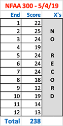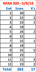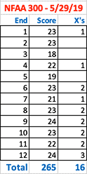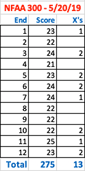 May 20, 2019 - Day 33 - I shot one NFAA 300 round and scored 275/300 and 13 X rings. Bill re-sighted my bow after adjusting its arrow rest. At full draw, I felt my sight moving around a lot today. My draw arm felt the effects from overuse on Saturday. I feel a bit of a self-imposed rush to shoot quickly; I have to break out of that newly formed habit. I know I can get many ends of 25 and 5 X rings if I really focus and take my time.