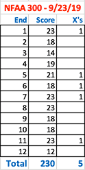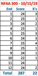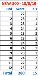 October 8, 2019 - Day 47 - It took me a while, but I finally got my shot back. I scored 264/300 and 9 X rings in the first round and 280/300 and 15 X rings in the second round. 280/300 is my best score yet. No end was less than 22 points. Whenever you feel you're losing your touch, always go back to basics and practice shooting at five yards to rebuild your confidence. I wonder if not having my binoculars on hand to check every shot actually helped me.