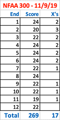 November 16, 2019 - Day 51 - A modest 265/300 and 16 X rings as I tried to microtune my sight to my new PS23s. I ended up buying new red nocks because I couldn't see the white ones on my arrows through my binoculars. What started as a fun two-hour excursion ended up being a traffic nightmare as I got stuck in a two-hour delay going home.