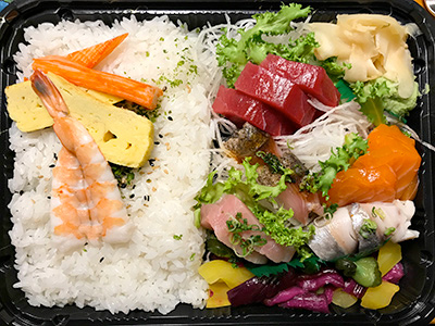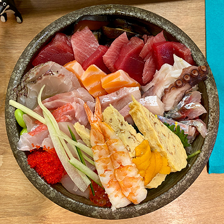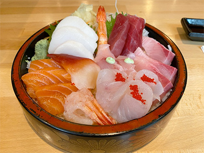 At $35, it's better than Kei Sushi's chirashi, but could be ranked higher with bigger portions. The scraps of salmon belly were so small as to be almost nonexistant. Are they just trying to give us a hint rather than a taste? The scallop was chopped up, funnily enough, to look like scraps. Gosh, please stop making chirashi look like scrap fish over rice! We're paying good money for this, not a ten-spot for a plastic container filled with odds and ends. That reminds me of a roommate of mine from long ago who recommended I purchase scrap salmon from the supermarket to save money. Scrap salmon came in small plastic containters. That was back in my poor days. "The fish tastes the same after you cook it," she said. That was the best tip ever. For a chirashi to be so fish-focused is good, but I would've liked to have seen some ikura in it. Just replace one of the fish with ikura. That would elevate this dish to the next level. And please put all of this fine fish over rice! That's chirashi! This is just sashimi with rice on the side.
