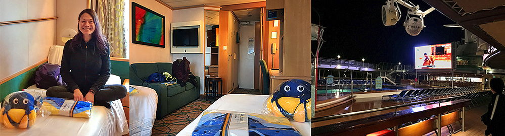 Our ship was very nice, better than the Carnival Pride my oldest son and I were on in 2016. It was a Deluxe Oceanview room with a large window and spacious accommodations. I had several surprises in store for my sons, including Royal Caribbean beach towels and an octopus doll for my youngest son. There were several onboard shows, including three music shows, one headed by Aaron MacKenzie of Jersey Boys, a magic show by Chris Dugdale, who appeared on Penn & Teller's Fool Us!, and comedian Billy Garan. Throughout the ship, there were smaller magic shows, demonstrations, art auctions, bingo games, dance parties, and more. The upper deck included shuffleboard, an arcade, and a rock climbing wall.