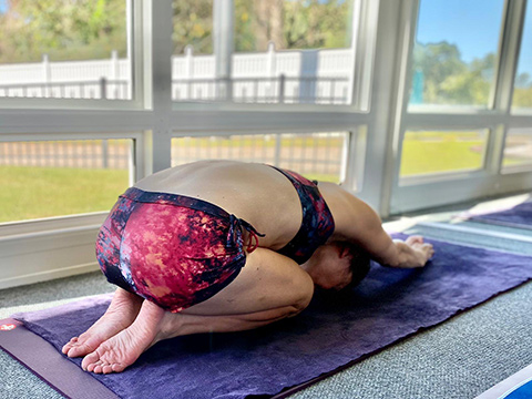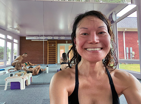 Wednesday, September 30, 2020 - Day 7 - Esak led a Bikram Yoga class from 9am to 11am. I was in the front row again. This morning was the first time I seriously looked at myself in the mirror. Holy shit, there was some serious definition all around my ribcage! I lost inches off my hips, but my body looked much better than it did when I was competing in the Northeast Regional when I was seriously in shape. We returned to the yoga studio at 12pm for two hours of competition practice with one of my DJ sets playing in the background. Michel was instrumental in getting my music played, reminding the JFC teachers that we should have a "Clare Day." At 2pm, Esak led a discussion where we all openly shared our feelings about everything that happened during the week. I talked about how I overcame an incredible amount of neck and back pain I experienced in the past months so that I could prepare myself for the rigors of JFC training and how everyone was so encouraging and inspiring in my journey to walk the wall. I especially enjoyed my moments with Dragan, an experienced JFC member, and Barbara, a new JFC member like me. Roland was awesome, always dancing and putting everyone at ease during our sometimes painful wall-walking exercises. If he ever entered competition, he'd be a force to be reckoned with. "I'm very impressed with the people in this room. It's uncommon for everyone in a class to finish JFC training," Esak admitted to us. "It's been a while since I've had a competition focus in these trainings. Thank you to all the people competing in USA Yoga and IYSF." From 3pm to 7pm, we returned to the yoga studio again for freeform practice and pictures with a professional photographer. We also had the option of having individual pictures taken, which I gladly did. Melissa, our photographer, and I had an instant connection, since we were both MINI owners. "You're my new favorite person," she said. For dinner, our chef prepared a vegan bbq feast with fried oyster mushrooms, fried cauliflower, roasted cauliflower, collard greens, vegan mac 'n' cheese, potato and tofu “egg” salad, cucumber salad, pumpkin pie cheesecake, and pineapple coconut pie.